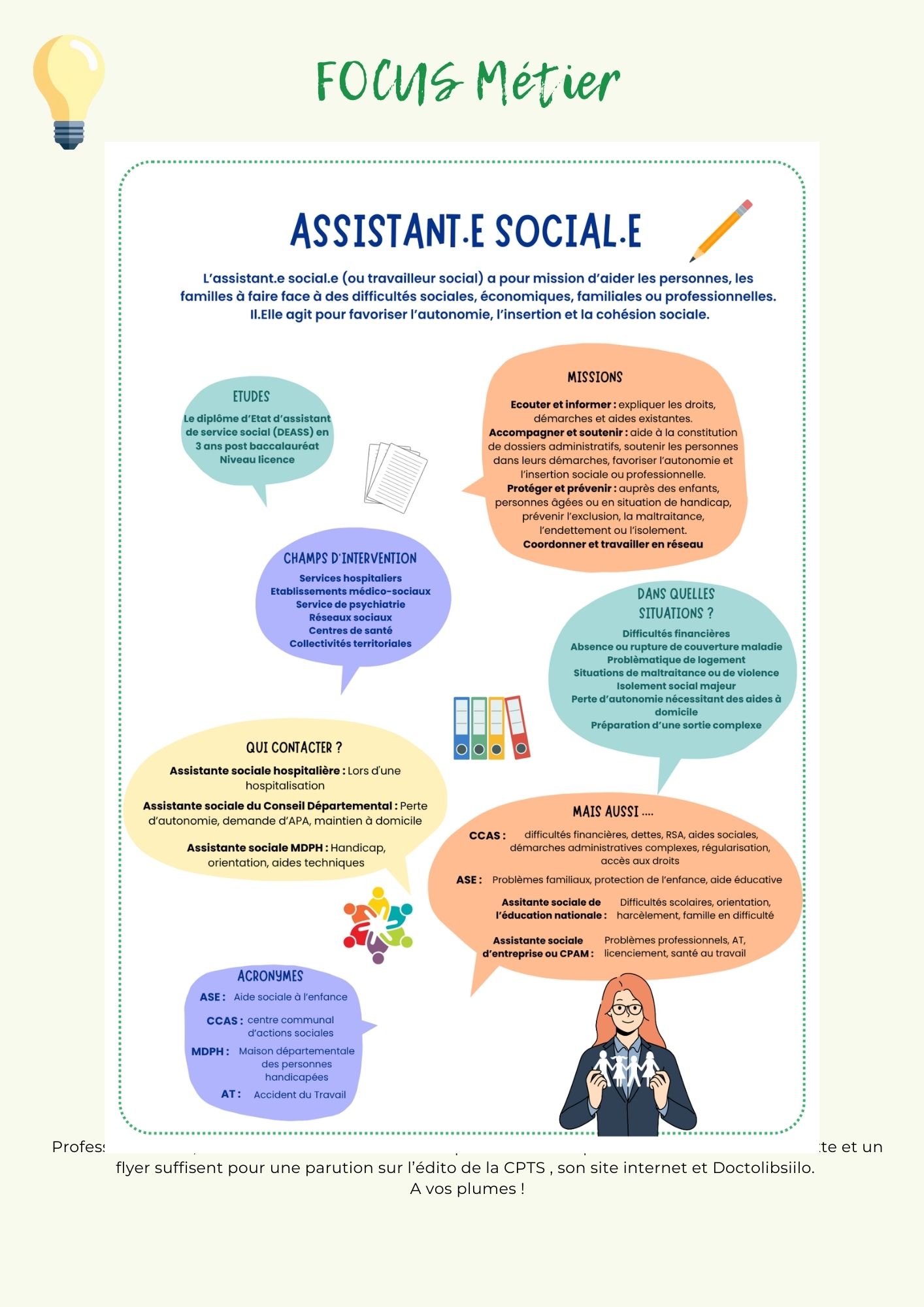 L’assistante sociale accompagne et soutient les personnes dans leurs démarches sociales, administratives et parfois médicales, afin de les aider à faire face à des difficultés personnelles, familiales, professionnelles ou financières.